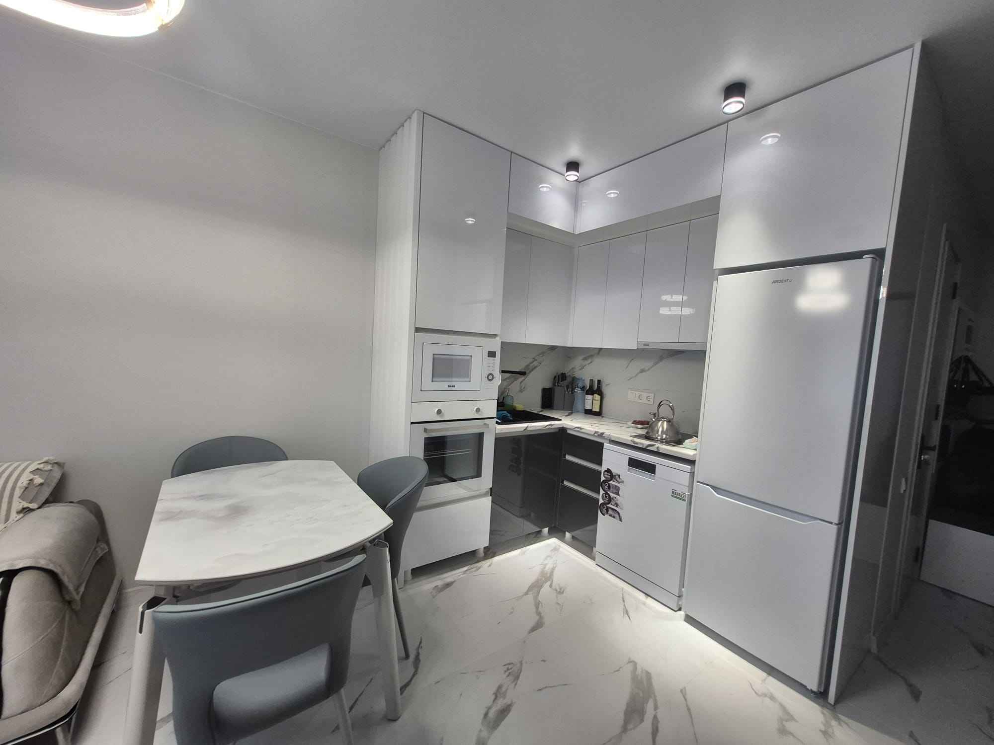 встроенная кухня с техникой — варочная панель, духовка, холодильник, посудомоечная машина, стиральная машина;