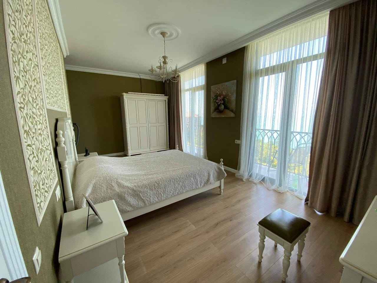 5 спален, в двух из которых есть гардеробные и душевые с туалетом, в одной только душевая.