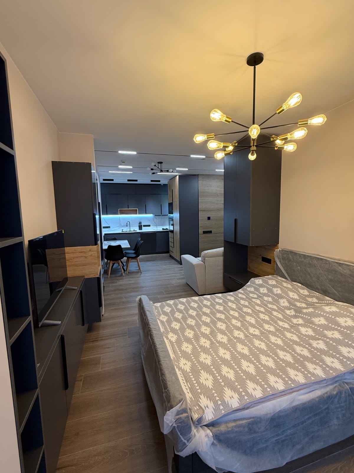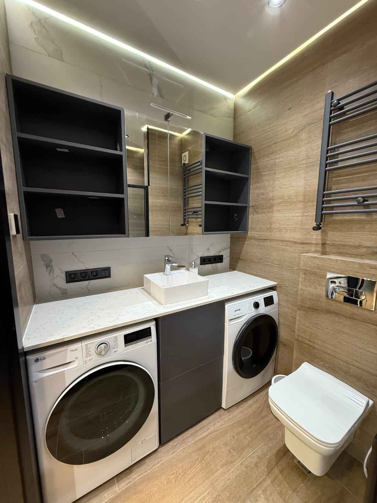 Все столы и столешницы из кварца. Одним словом, идеально подходит для семьи, со всеми удобствами, экологично, энергоэффективно и соответствует стандартам безопасности (работает также система пожарной безопасности). Достаточно места для хранения вещей, много розеток.