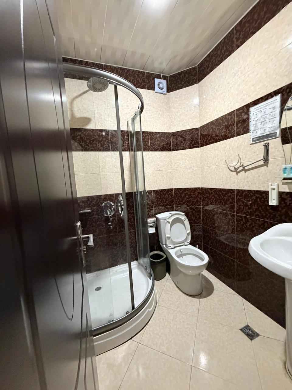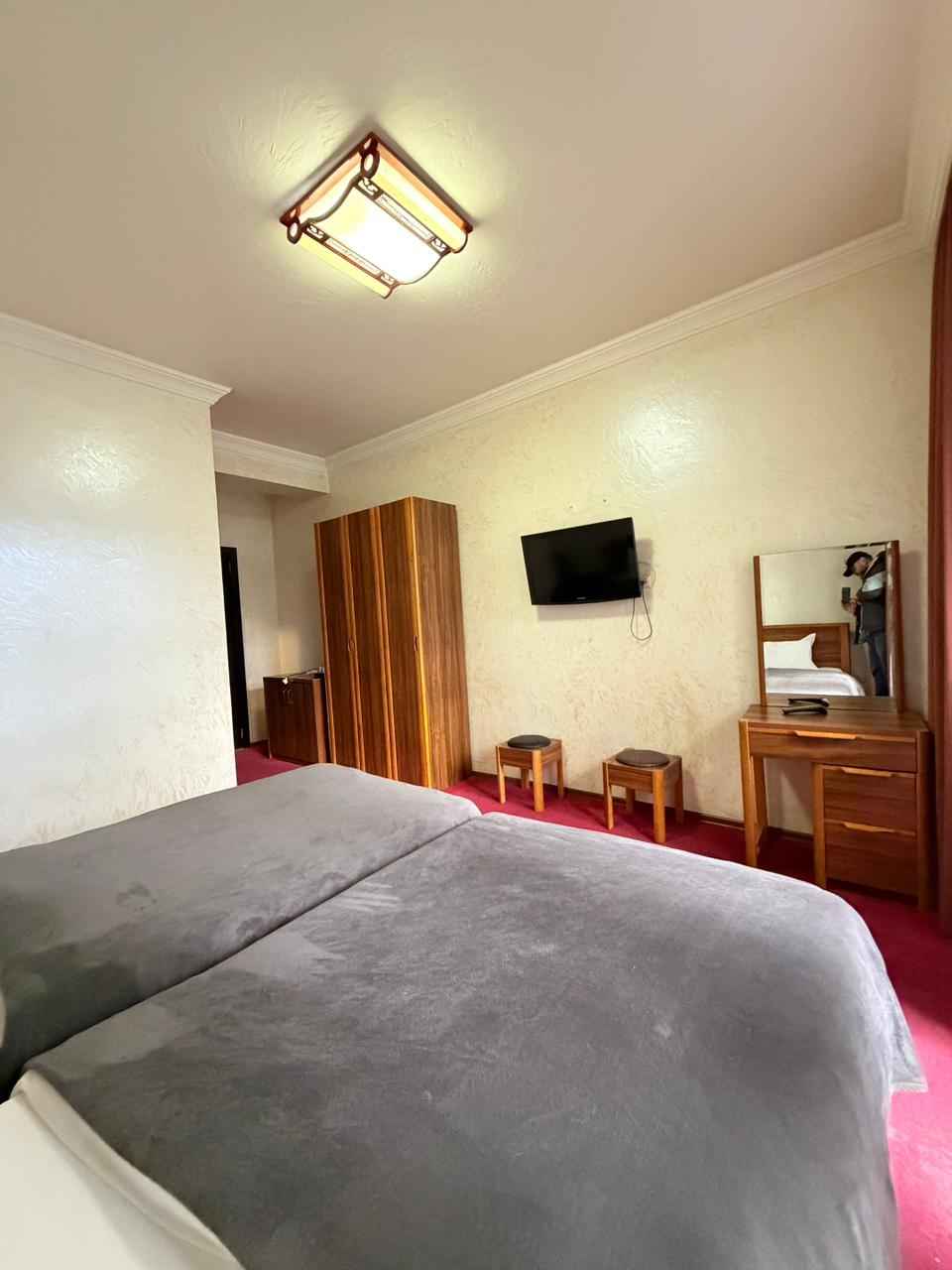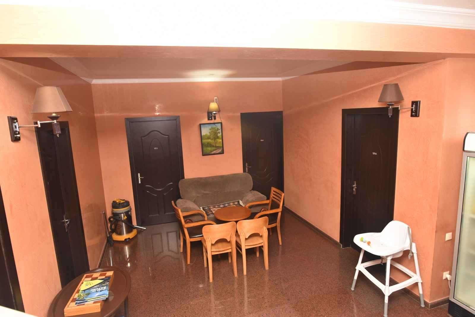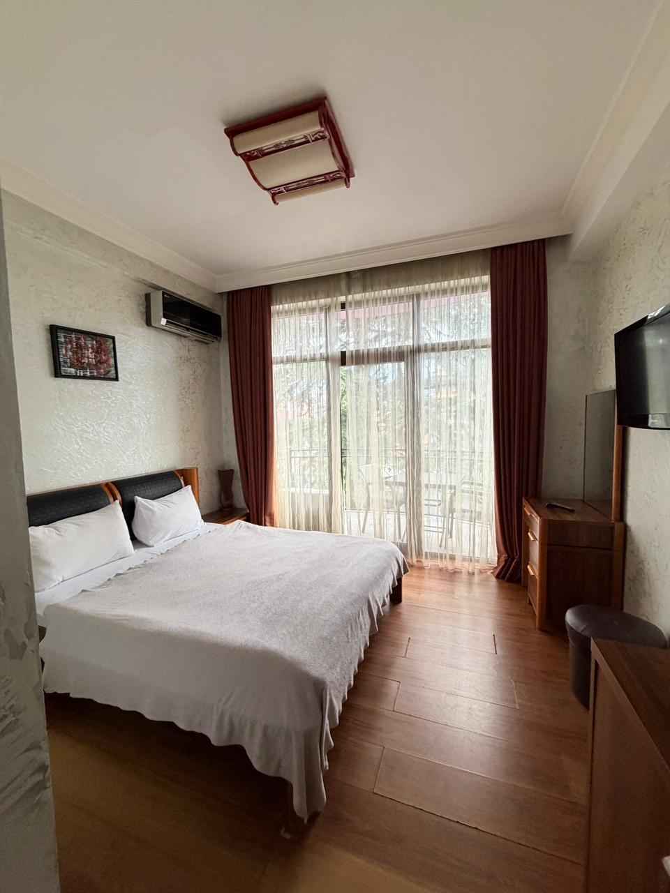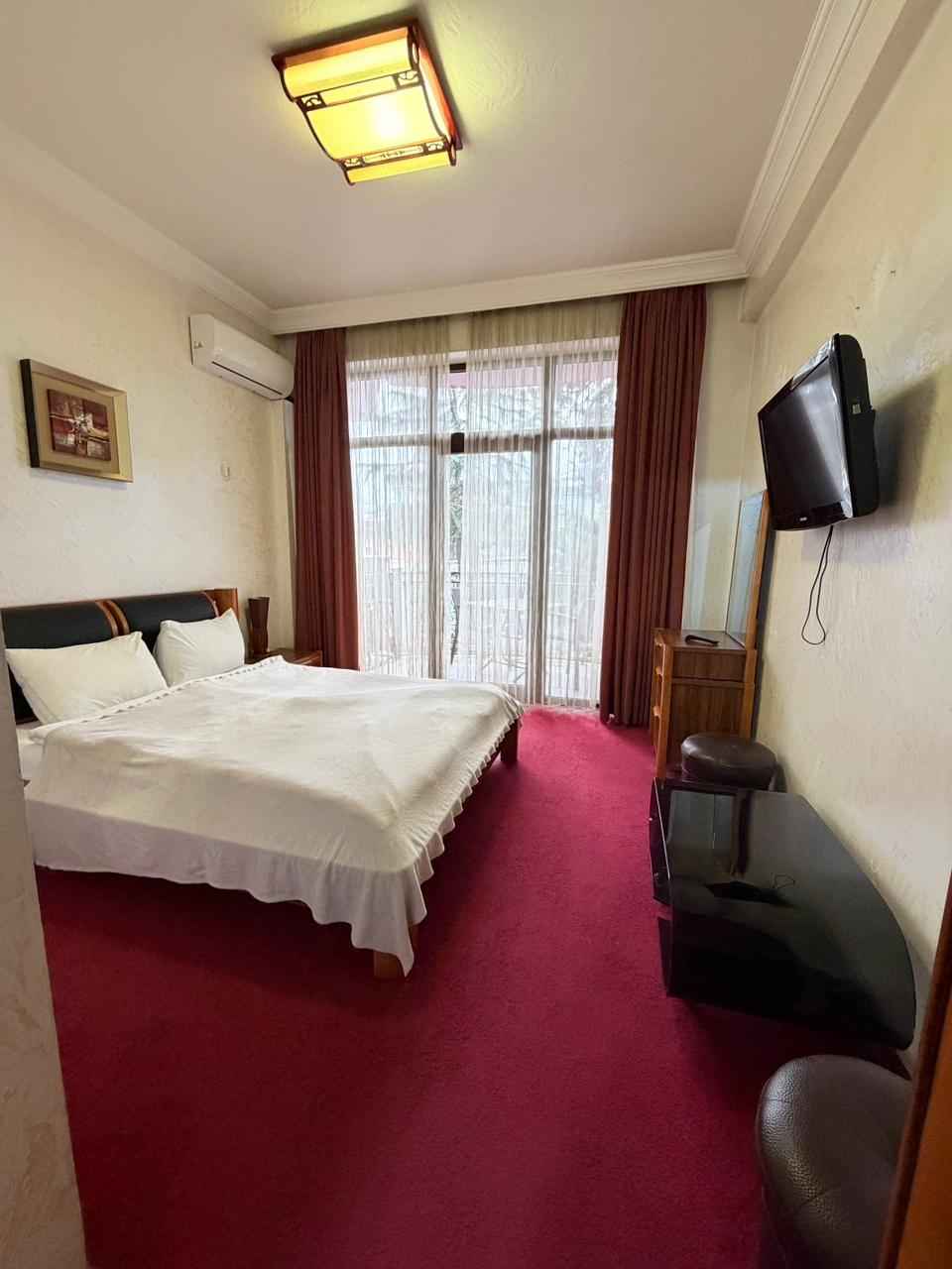 იყიდება. შენობის საერთო ფართობია 762 კვ.მ, საიდანაც 250 კვ.მ რესტორანს უკავია. ნომრების ფონდი მოიცავს: სამ სტანდარტულ ნომერს აივნით, თითოეული 21 კვ.მ ფართობით, სამ სტანდარტულ ნომერს აივნის გარეშე, თითოეული 20 კვ.მ ფართობით, სამ სტანდარტულ ნომერს აივნის გარეშე 3 ადამიანისთვის, თითოეული 24 კვ.მ ფართობით, სამ ლუქსს აივნით, თითოეული 35 კვ.მ ფართობით, ერთ სტანდარტულ ნომერს ერთადგილიანი საწოლებით და აივნით, თითოეული 23 კვ.მ ფართობით და ოთხ ერთადგილიან ნომერს აივნით, თითოეული 16 კვ.მ ფართობით. ნომრების საერთო ფართობია 387 კვ.მ. Продается. Общая площадь здания составляет 762 кв.м., из которых 250 кв.м. занимает ресторан. В номерной фонд входят: три стандартных номера с балконом, каждый площадью 21 кв.м., три стандартных номера без балкона, каждый площадью 20 кв.м., три стандартных номера без балкона на 3 человека, каждый площадью 24 кв.м., три люкса с балконом, каждый площадью 35 кв.м., один стандартный номер с односпальными кроватями и балконом, каждый площадью 23 кв.м. и четыре одноместных номера с балконом, каждый площадью 16 кв.м. Общая площадь номеров составляет 387 кв.м.